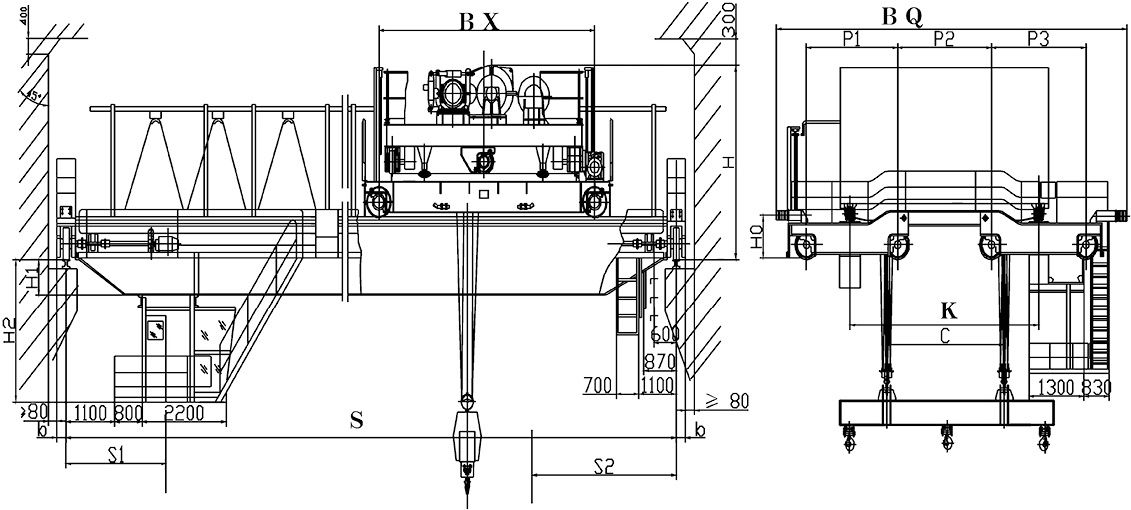 起重机工作级别A3~A7,常用起重量为3~250t。适宜在环境温度-20℃~40℃,相对湿度不大于85%的工厂、仓库及货场等处作装卸吊运工作,禁止在易燃、易爆以及充满腐蚀性气体的环境中工作。