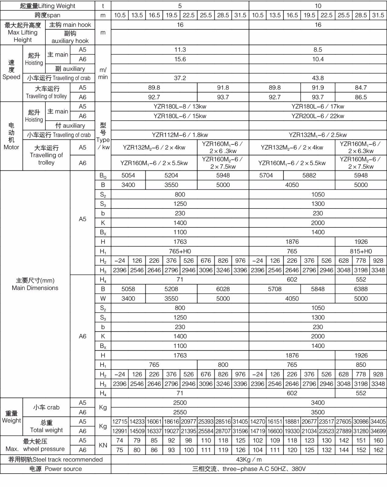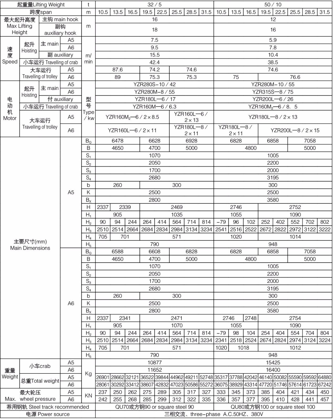 QD型吊钩桥式起重机,主要由桥架、大车运行机构、小车、电器设备等组成。根据使用频繁程度不同,分为A5、A6二种工作级别。